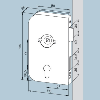 Schloss für Drücker mit Rosetten, vorgerichtet für Profilzylinder, mit Wechsel, Behördenausführung, für 8 bzw. 10 mm Glasdicke.