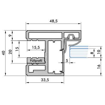 Verwendung ohne Füllprofil 608551 Nut 20 mm für maximale Glasdicke bis 17,52 mm