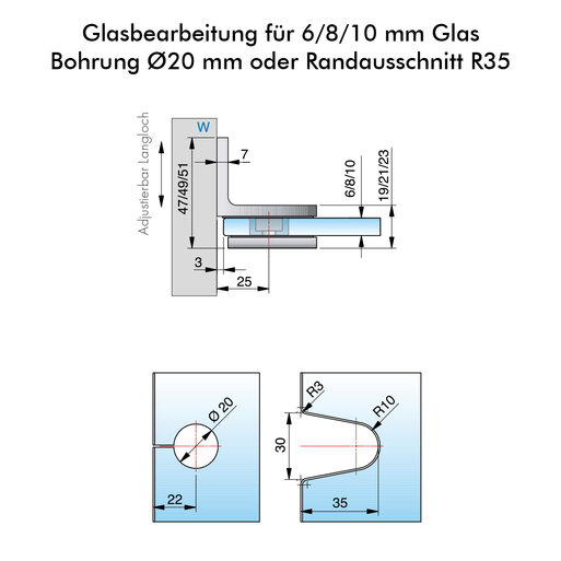 Wandbefestigung mit Langlochverstellung und Abdeckplatte(n) für verdeckte Verschraubung.