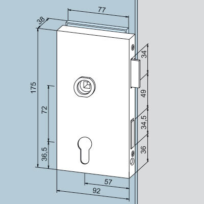 Schloss mit Drückerführung, vorgerichtet für Profilzylinder, mit Wechsel, Behördenausführung, für 8 bis 10 mm Glasdicke.