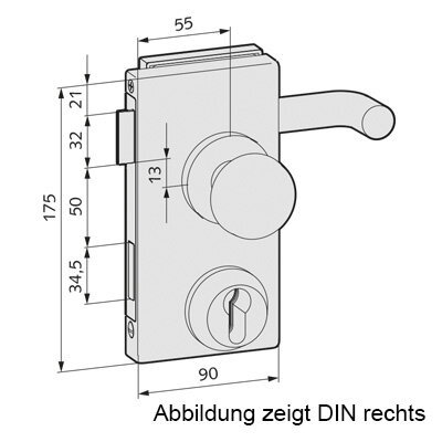PZ-Schloss mit Wechselgarnitur, eckige Form, Panikfunktion E, rechts auswärts öffnend