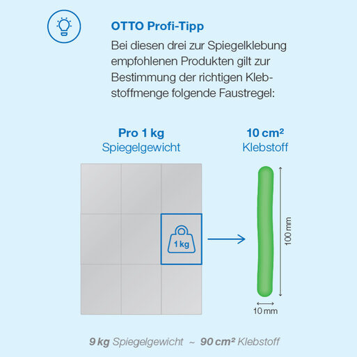 • Mit OTTOCOLL® S 16 dürfen nur Spiegel geklebt werden, deren Reflexions- und Schutzschicht der DIN 1238 5.1 und der DIN EN 1036 entsprechen. Im Zweifelsfall bitte unbedingt dazu Informationen des Spiegelherstellers einholen