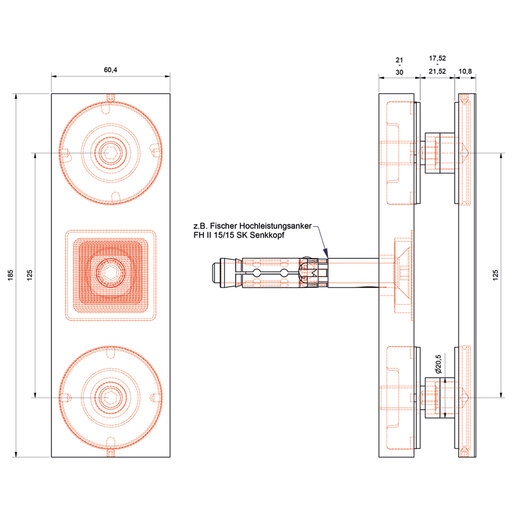 Doppelpunkthalter - eckige Ausführung 185 x 60 mm, WA: 21 - 30 mm, V2A