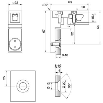 P&S Glashalter flächenbündig, eckig, beweglich, für Stabistangen 15x15 mm
